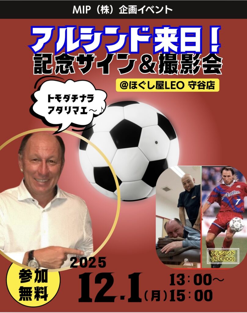 2025年12月1日 「ほぐし屋LEO守谷店」で元鹿島アントラーズのアルシンドさんのサイン会&撮影会が開催されました。